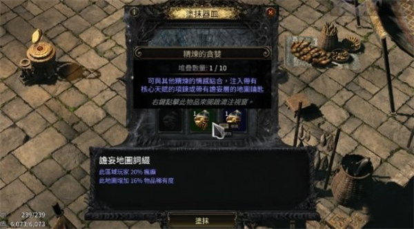 放入3个精炼的贪婪能给地图增加词缀:此区域玩家20%疯癫、此地图增加16%物品希有度。