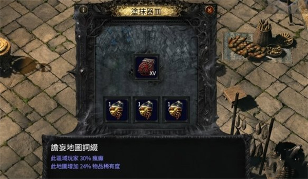 玩家选择想要提高的地图将它放于流放之路2地图爆率提高方法上方的格子,下方三个放入涂抹材料进行涂油。