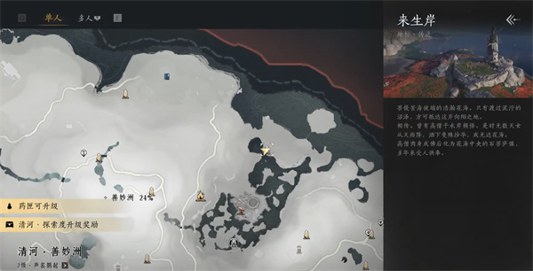 青衫执笔武学想要获得可以传送到来生岸传送点,然后向西北方向看,可以看到一个山洞,具体位置如下图。