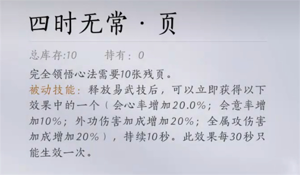 心法四时无常获得可以去开封的勾栏瓦肆附近的曹生书画店那里,进入店铺我们和npc曹生对话。选择询问特别的宝贝,再选择让我看看,我们就能看到心法:四时无偿的残页,一共10页。总共需要5000长鸣玉就能获取。
