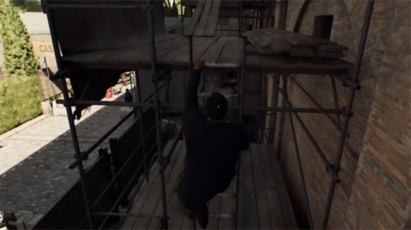 依循既定路线抵达地图左侧方位,顺着右墙的架子攀爬至高处,待走到尽头后,通过楼梯下行,顺利进入帐篷: