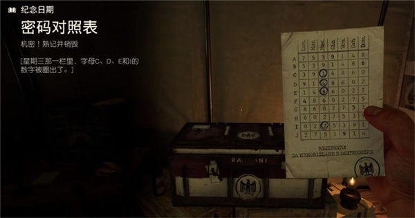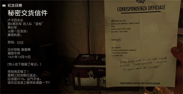 任务的线索位于附近的桌子和抽屉里,包含了《密码对照表》、《秘密交货信件》和1937年10月的日历页。
