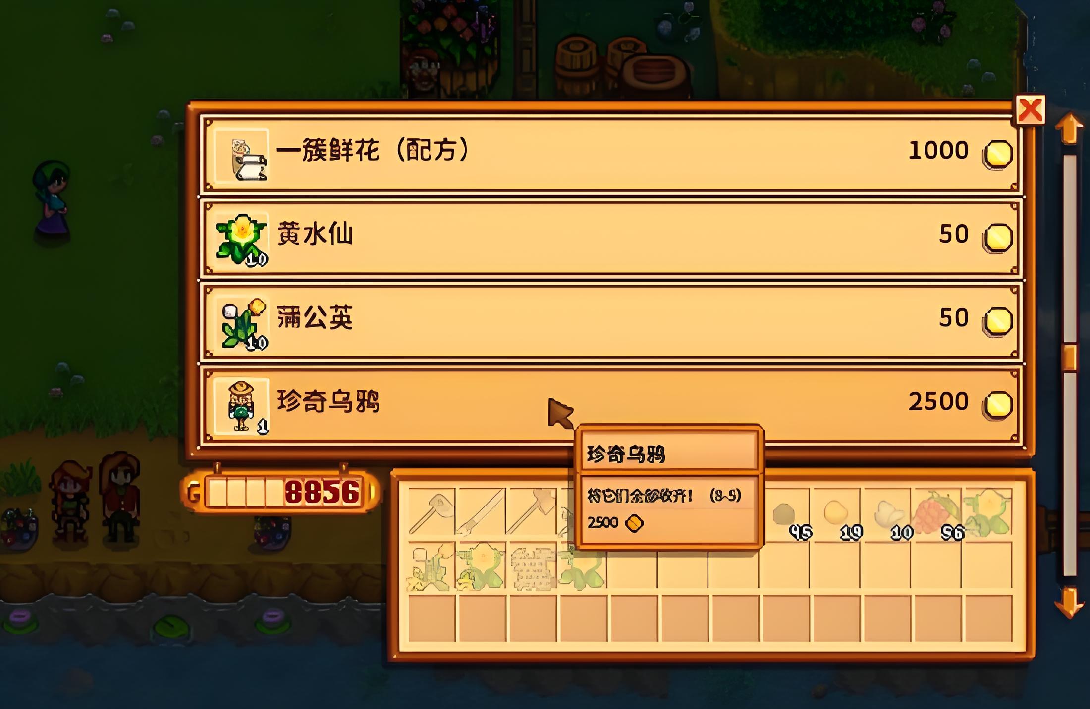 5、皮埃尔设临时摊位售普通鲜花和乌鸦雕像,前者实用低后者为收藏品,新手建议优先储备种子饲料等资源。