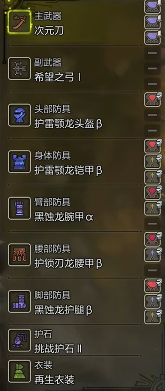 1、主武器选用次元刀其自带15至20点会心值,为后续堆叠会心率奠定基础,是该配装的核心武器选择。