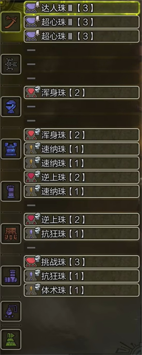 5、脚部配置挑战珠III与体术珠I,强化挑战者叠加效率并补足细节加成,适配高难度及弱点难命中狩猎。