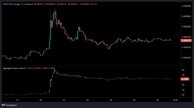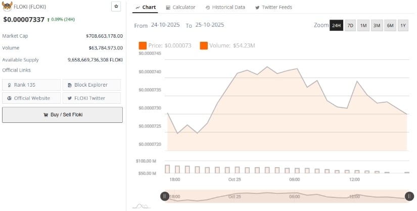 BraveNewCoin数据显示,FLOKI现报0.00007337美元,24小时微涨0.09%。其市值维持在7.086亿美元水平,对应6378万美元的24小时交易量。