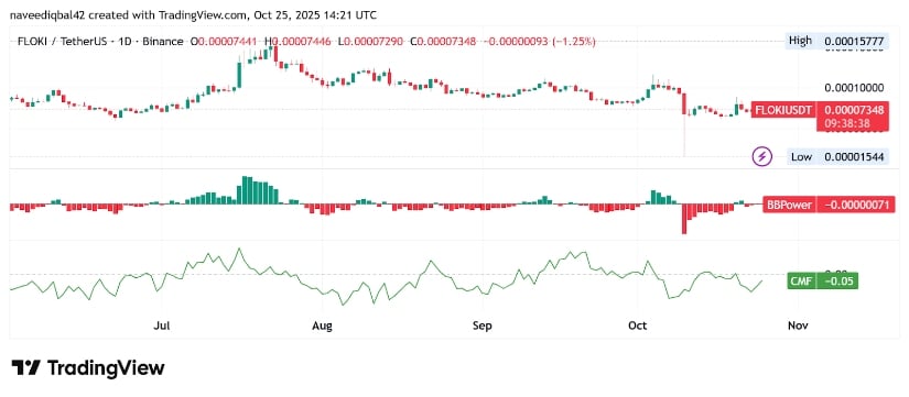 截至撰稿时,TradingView显示FLOKI报价约0.0000732 USDT,呈现宽幅震荡格局。近几个月该代币最高触及0.0001577美元,最低探至0.00001544美元,波动剧烈。图表显示10月初暴跌后反弹乏力,持续处于区间底部附近盘整。