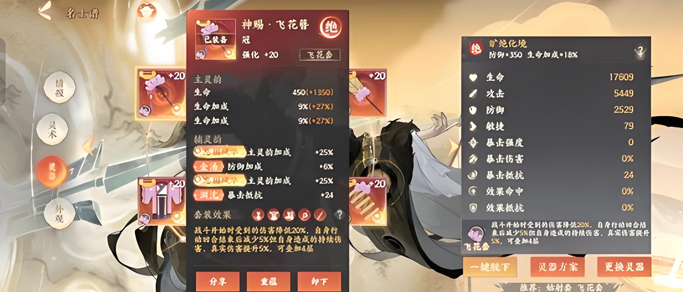 5、灵器首选飞花增眞伤承佑为下位替代,猫属性全攻为主,灵器各部位优先洗双风,攻击部位选攻击加成防御部位选爆抗或生命加成。