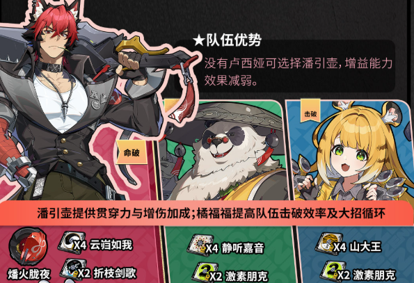 1、潘引壶可以为队友提供贯穿力和增伤加成效果,搭配真斗可快速将敌人击败。