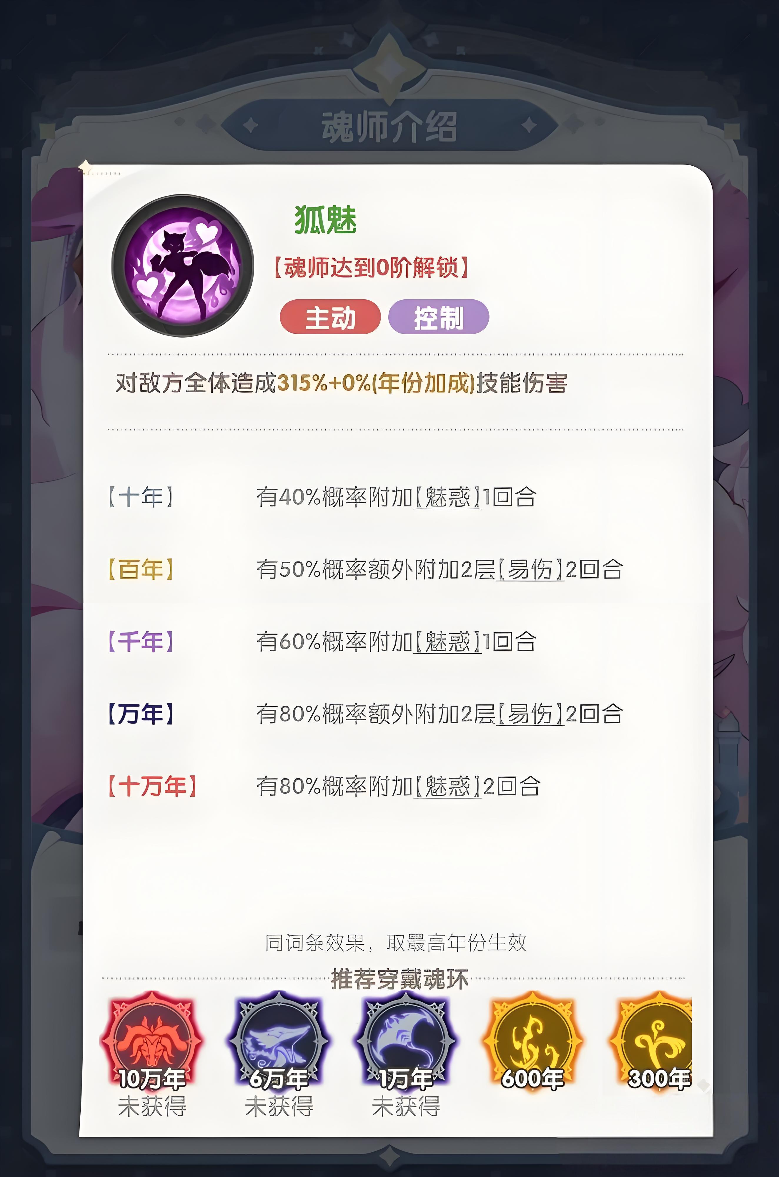 1、主动技能狐媚对敌方全体造成高额技能伤害,随魂环年份提升魅惑和易伤附加概率最高达八十,持续两回合限制敌方行动。