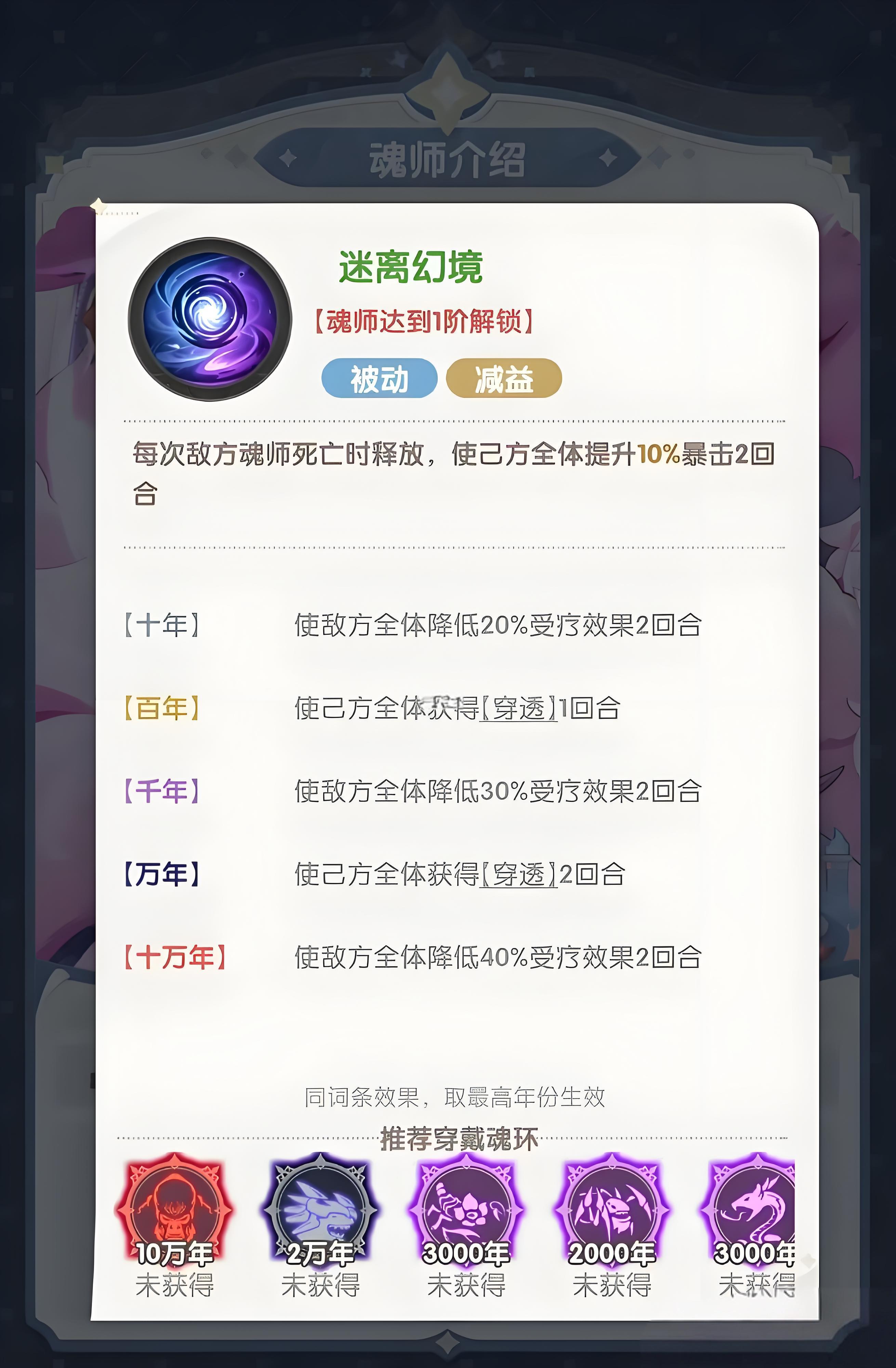 2、被动迷离幻境在敌方魂师死亡时触发,提升己方暴击降低敌方受疗效果,解锁穿透效果针对性克制治疗魂师和前排肉盾。