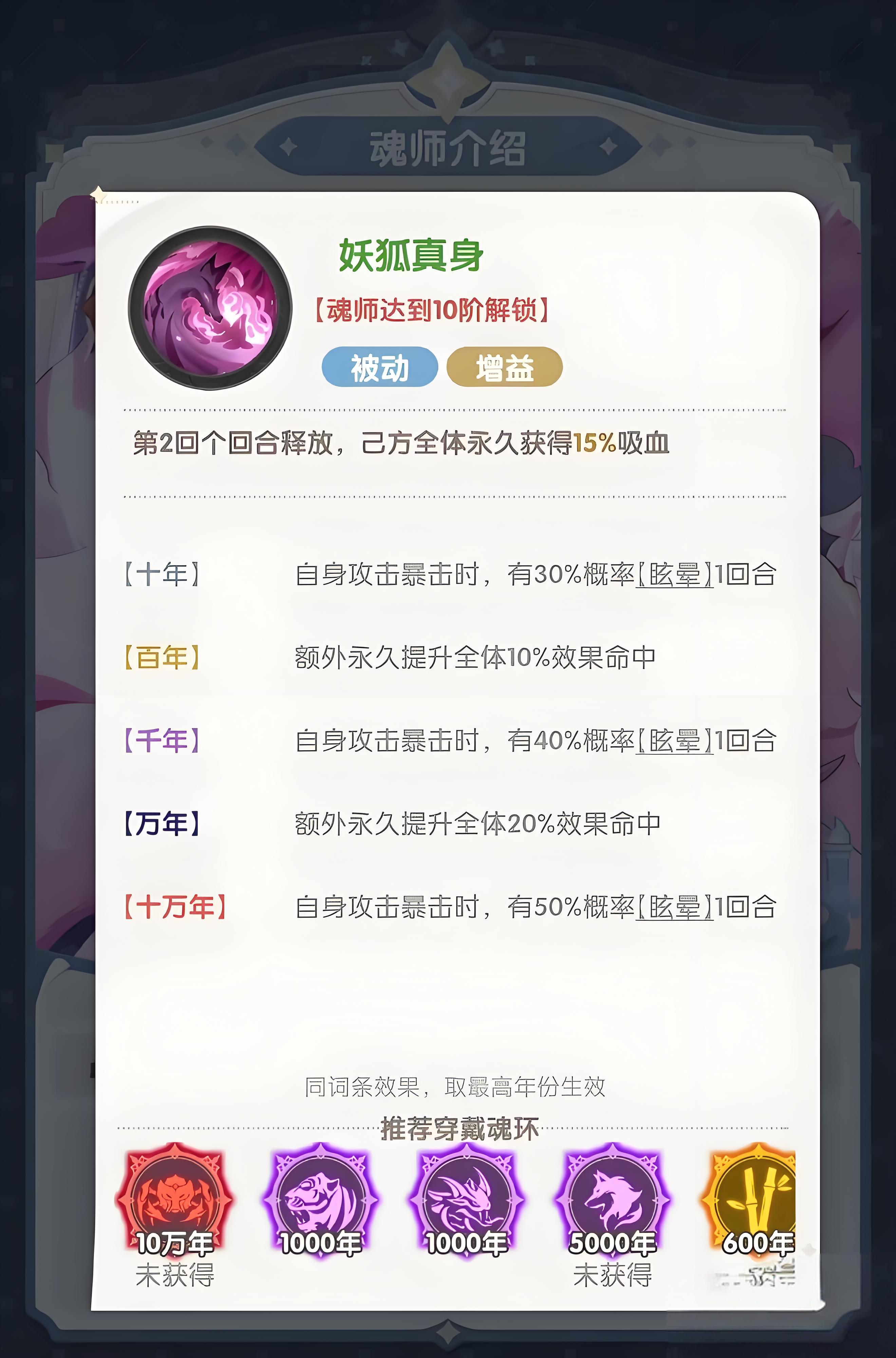 3、被动妖狐真身第二回合释放,己方全体永久获得吸血加成提升效果命中自身暴击时有概率眩晕敌方强化团队战力。