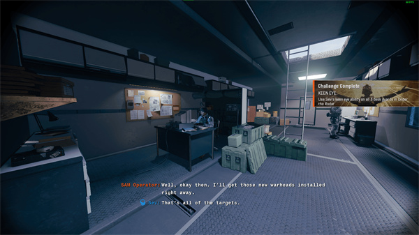 下一名警卫在SAM现场,但相反,进入SAM现场警卫正南方的大楼,发现一名男子拿着枪睡觉。走进他面对的房间,拿起剪线机。然后去找SAM现场警卫,用以下对话与他交谈。