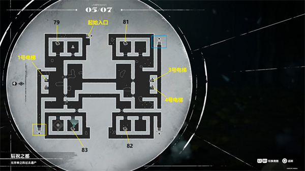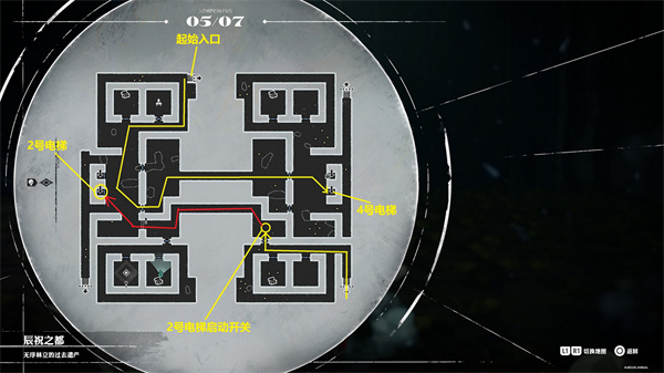 具体路线:从起始入口开始,按照黄线来到4号电梯,坐电梯下去来到地图06/07,继续按照黄线上楼梯,楼梯上来后回到地图05/07东南方,继续按照黄线走,打开2号电梯的开关,接着按照红线去做2号电梯。下去后,在地图06/07西侧,把红圈3个感叹号的门都关闭后,再去追本体,本体打完全部分身消失。
