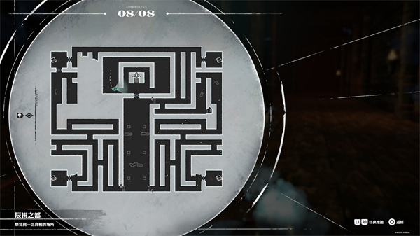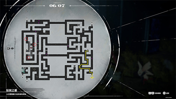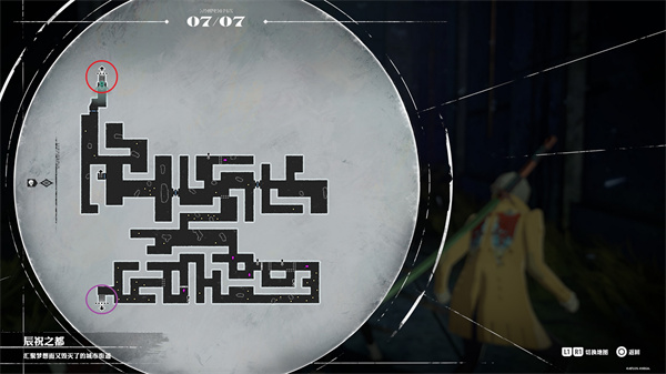 1号电梯下去的地图07/07,一路向南走,期间的光点自行探索,最后来到南部紫圈楼梯上去,回到地图06/07的西南方紫圈楼梯处,一路向东南方走,地图东南方房间的宝箱85,里面是星白面具,拿完后绕一圈向东北方,坐4号电梯回去。