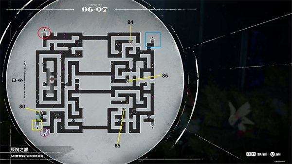 起始入口西侧,休息室西侧的宝箱79,里面是纯白铠甲;向地图西南方走,黄框处楼梯下去,来到地图06/07西南方隔间,隔间北部的宝箱80,这个宝箱是宝箱怪,击杀获得雷神之枪;楼梯回到地图05/07,一路向东走,东北方房间的宝箱81,里面是月女神之拳;坐4号电梯下去,地图06/07重走一遍之前黄线(上面图)上楼梯,回到地图05/07,东南方房间的宝箱82,里面是孤注一掷算盘;按照红线,现在去地图05/07西南方,西南方房间的宝箱83,里面是溺爱项圈,同时去隔壁房间把3号电梯的开关打开。这样地图05/074个宝箱就拿了。