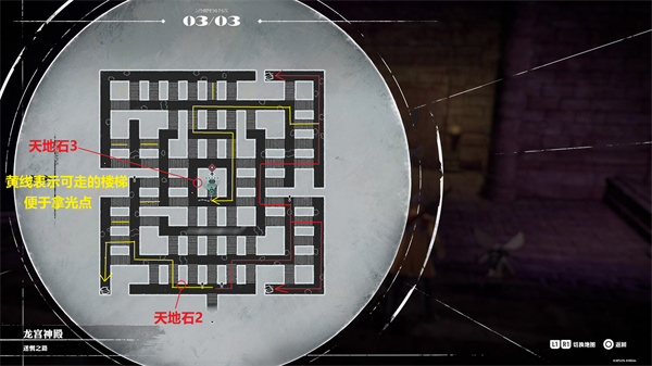 走右侧红线,按照红线向北走,最后再接着黄线走,到达最中间位置,别忘了左侧的天地石3要拿。