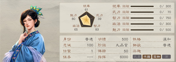 智力型老婆,自带1级天启很有用,83智搭配上全2级的智谋栏用来搞计谋破坏是可以的。