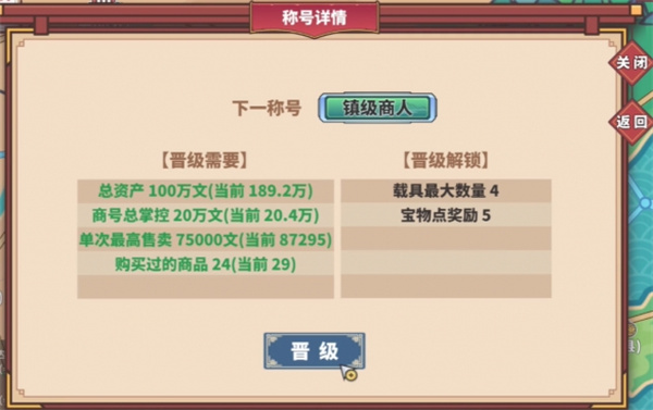 1、商人等级在游戏中是十分重要的要素,有许多功能都是随着商人等级上升才会解锁的。想要成为镇级商人,我们需要满足以下条件: