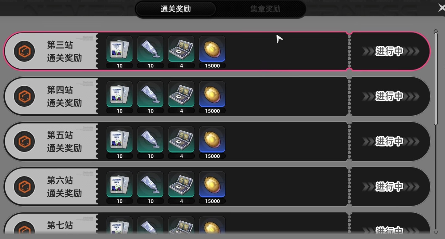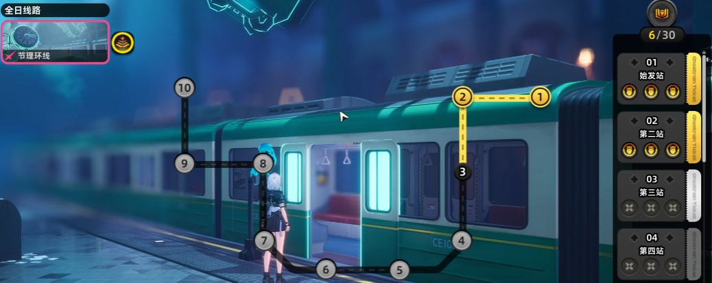 在轨外之境中,玩家需搭乘电车依次通过10个站点,即10个独立关卡。每成功完成一关并达成完美条件,即可获得3枚猫头鹰徽章以及对应关卡的专属奖励。每个关卡设有特定目标,例如第3关要求同时满足击败全部敌人、剩余时间超过240秒及300秒三项标准,唯有全部达标方可领取全部3枚徽章。