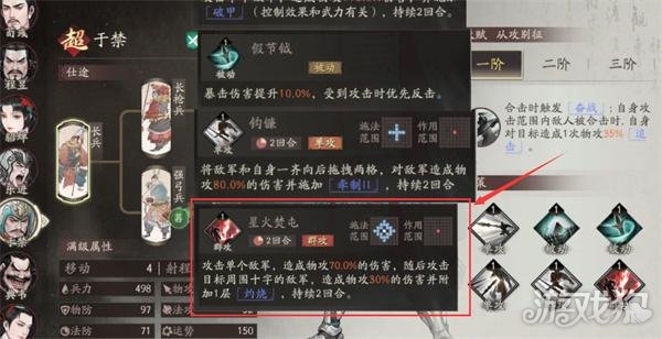 于禁大招效果“星火焚屯”,冷却时间两个回合,属于群攻技,可以攻击单个的敌方目标,同时造成物理攻击70%的伤害,随后伤害会扩散,对周围十字目标的所有敌方军队,造成基于自身物理攻击30%的伤害。