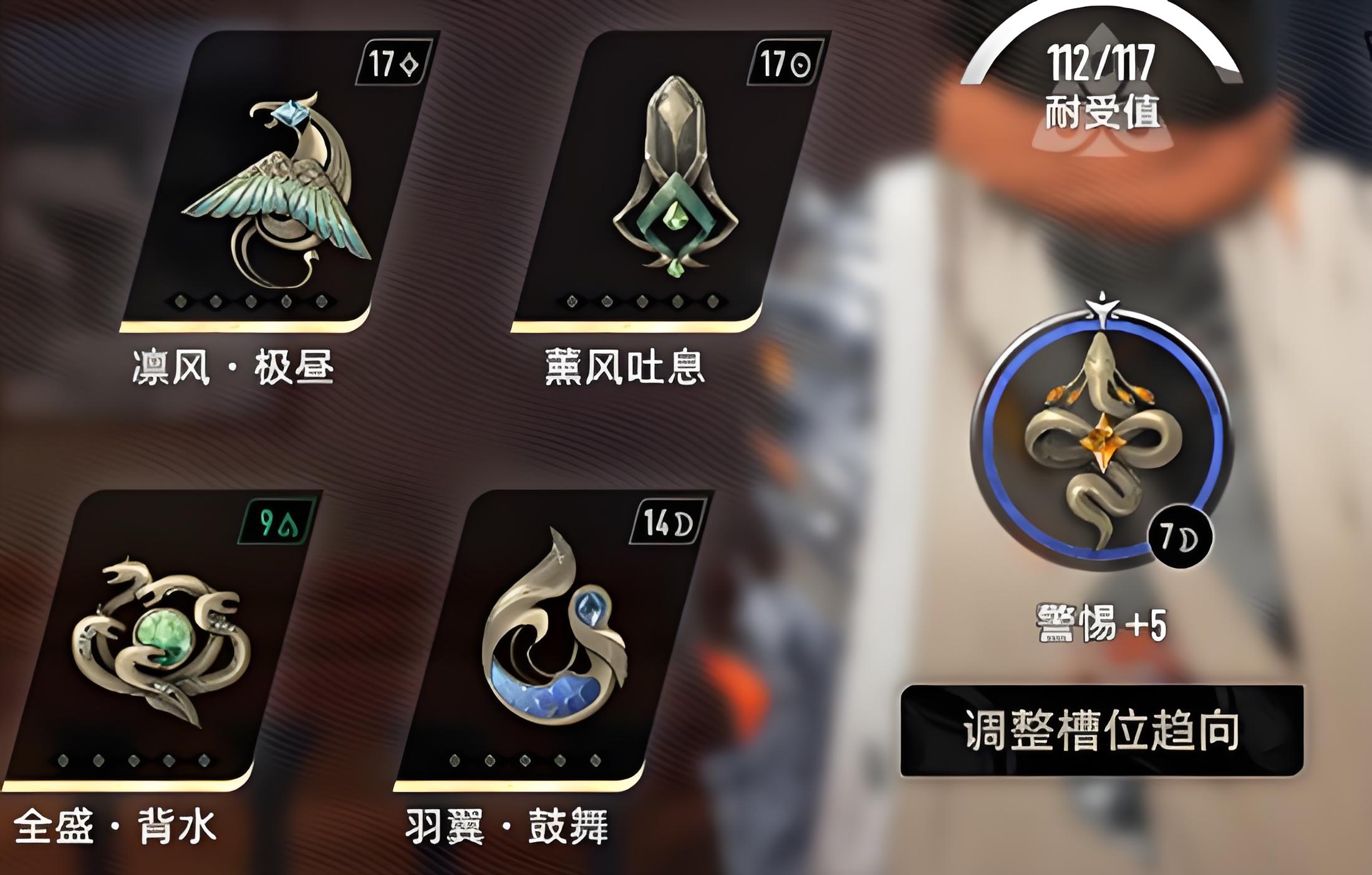3、后期毕业以高爆发为目标,熏风吐息强化大招增伤,羽翼鼓舞提升技能流畅度与最大神智,剩余位置搭配炽灼背水拉满背水战法收益。