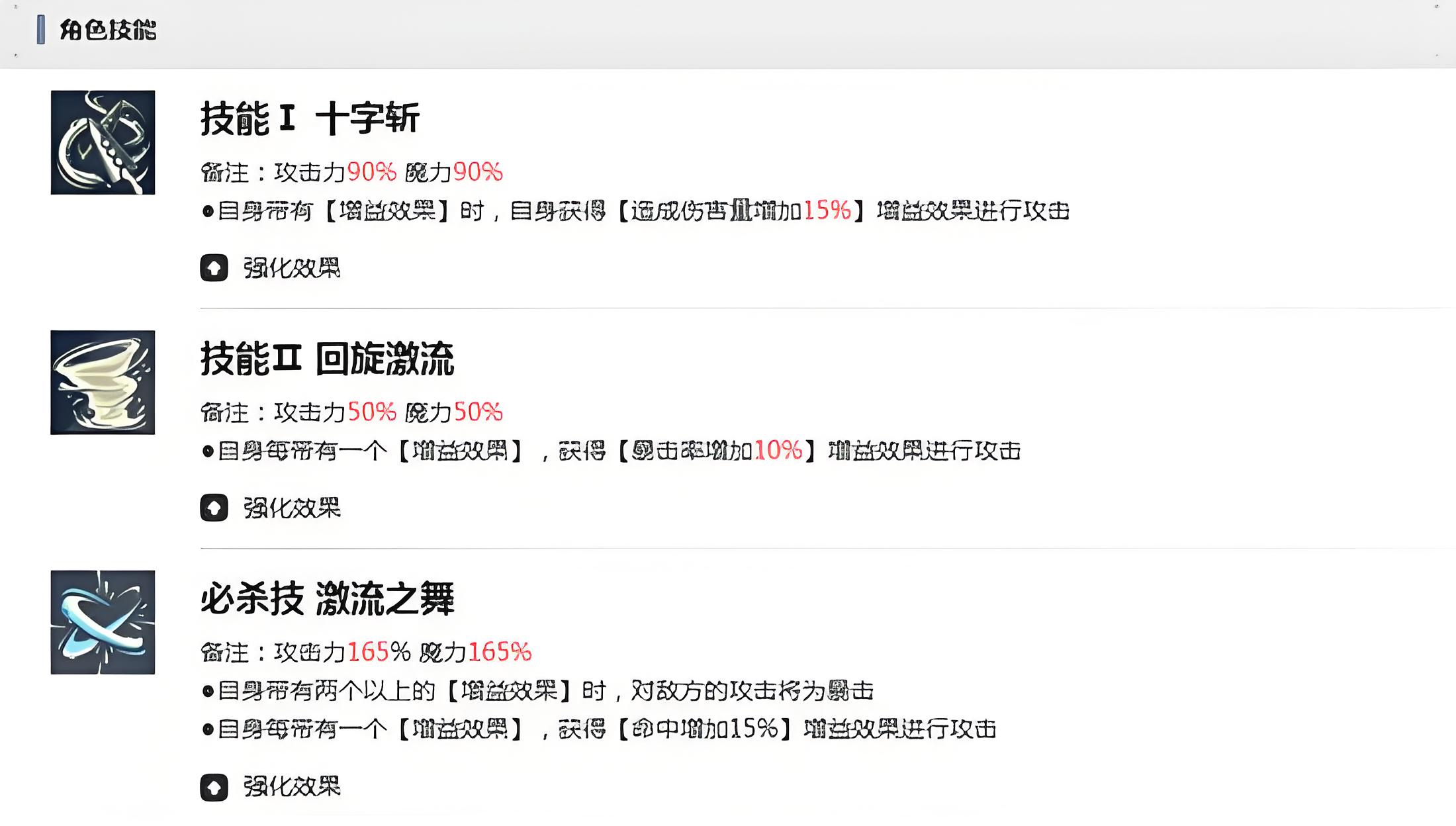 2、基础技能十字斩倍率90%,自身有任意增益时额外提15%伤害,频繁触发增益的战斗中加成稳定叠加保持常规输出高效。