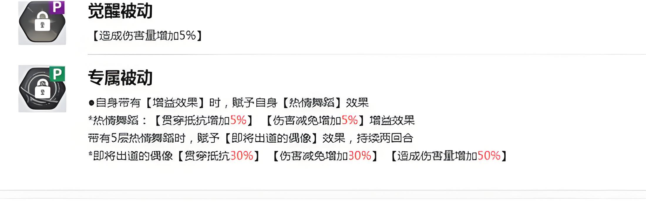 5、觉醒被动加5%固定伤害专属被动带增益每回合叠热情舞蹈,每层增5%贯穿抵抗与伤害减免,配全队增益角色速进强势期。