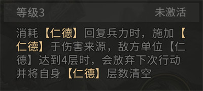 刘备的天赋技能围绕着【仁德】展开,可以在我方单位受到伤害后消耗仁德回复兵力,等级2的天赋技能可以再回复兵力时减免该次伤害的20%。