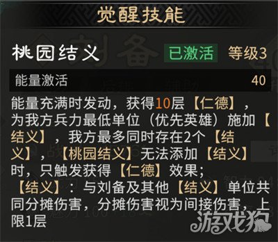 刘备的觉醒技能可以让刘备快速获得大量【仁德】层数,并且为我方兵力最低的单位施加【结义】为其分摊伤害。非常好的弥补了刘备【仁德】层数获取慢的问题,还给刘备提供很强的保人能力。