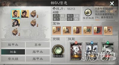 刘备在技能方面都差不多,主动技能依旧携带和衷共济;被动技能可以使用鼎力相助让主C打出更高的输出;追击技能携带临危不乱,给武力最高的单位治疗+镇定,可以让张辽/吕布免疫控制更好的打输出。
