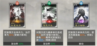 鼎力相助:回复我方单体兵力时,使其使其伤害提高,持续1回合。
