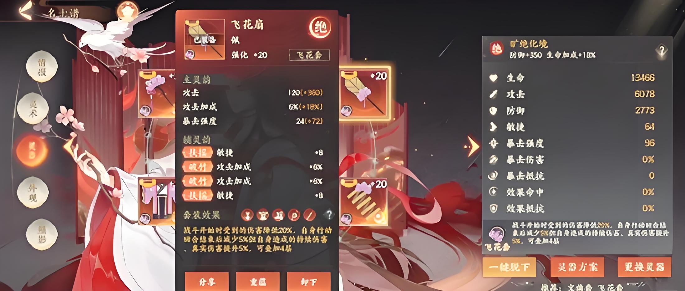 4、套装可选离火踏破文曲归云,离火冠衣选爆抗洗双风,鞋子选爆伤洗双风加敏,武器选爆强或爆伤。