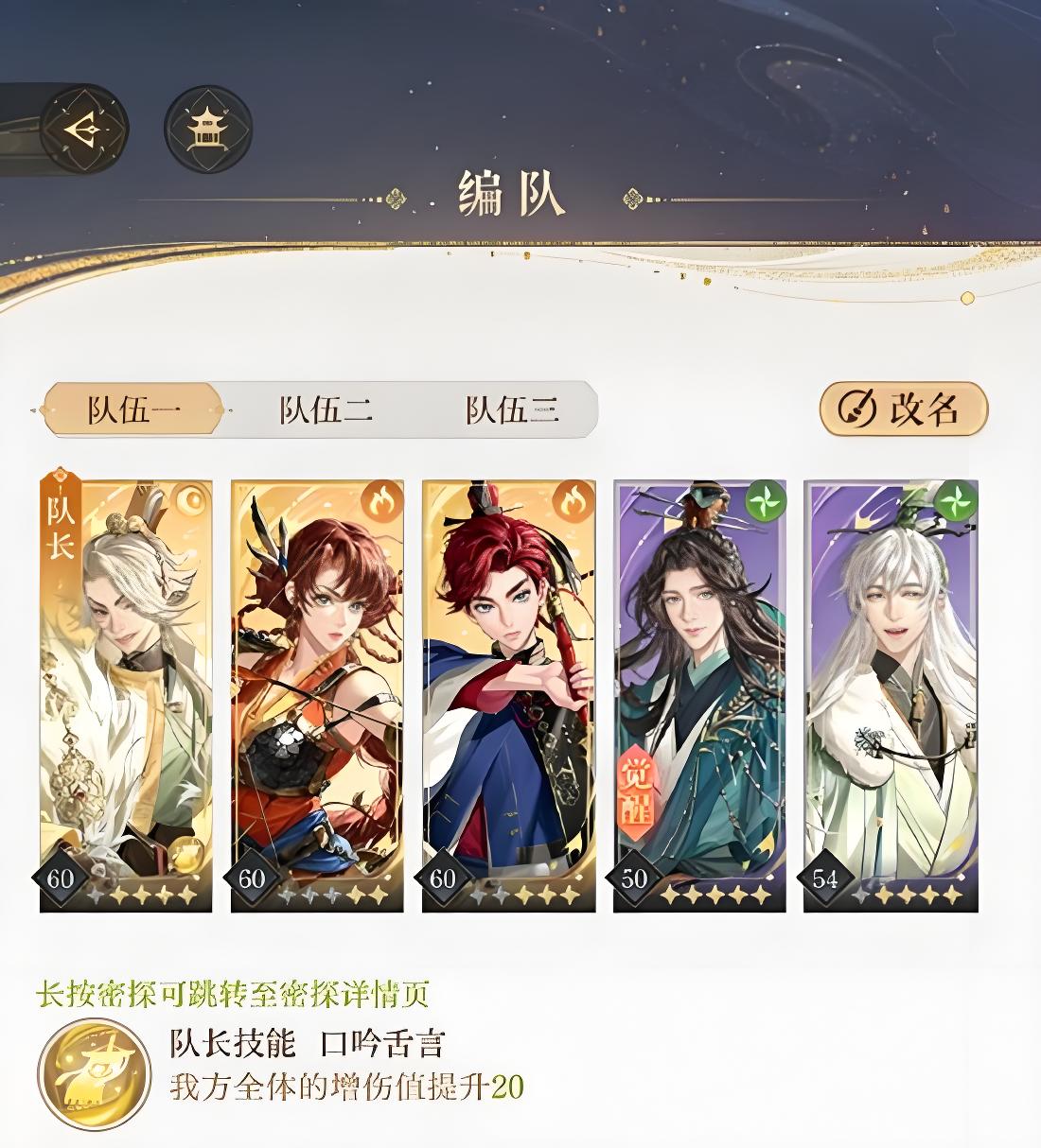 3、陈登作为辅助需优先觉醒,技能释放后为全队增加25点技能伤害,其能量回复技能保障密探频繁释放大招。