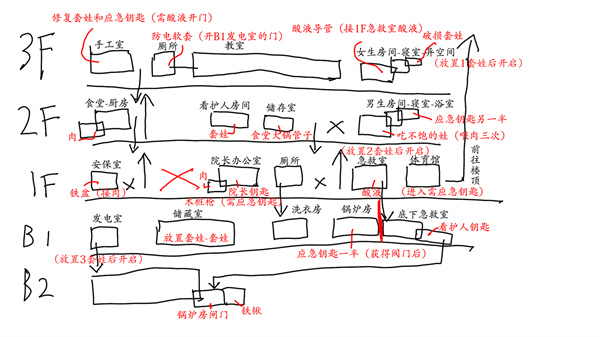 三楼:手工室(需酸液解锁,用来修复套娃和应急钥匙),下行楼梯,厕所-防电软套——教室,墙体崩塌封堵,女生房间-酸液导管,女生房间内1套娃房间-女生寝室-套娃。