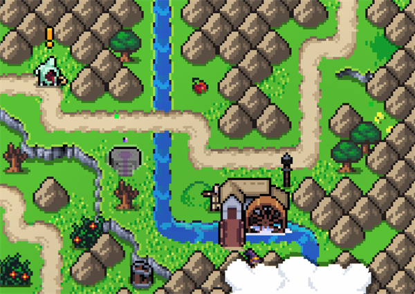 在路的尽头附近有一个水车和憎恶解锁,她坐在山后面。