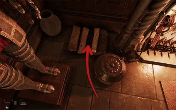 8、在壁炉左边的木柴堆下。