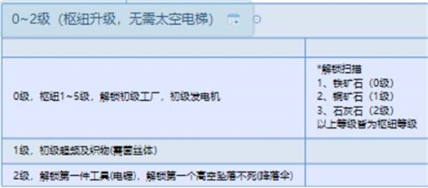 0级:枢纽1-5级,解锁初级工厂,初级发电机;