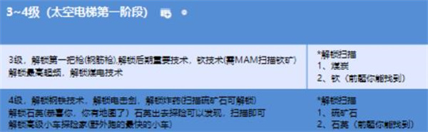 4级:解锁钢铁技术,解锁电击剑,解锁炸药(扫描硫磺石)解锁石英(探索扫描),解锁高级小车探险家。