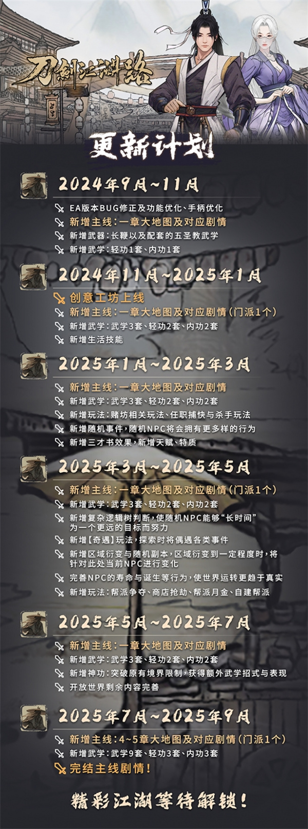 EA当前能玩的玩的内容包括了10个大地图,70万剧情文字,24套武学,12套轻功,17套内功,3个剧情门派。