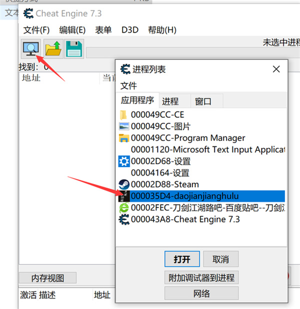 2、进入游戏,同时打开CE修改器,点击左上角,加载游戏程序进程。