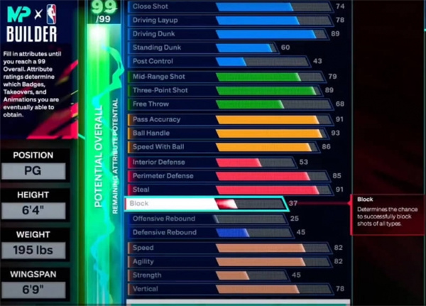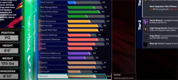 6、传球降到70,运球85。防守上降低抢断,给到内防和追帽,能有铜的盖帽大师。多余的点数给到篮板。
