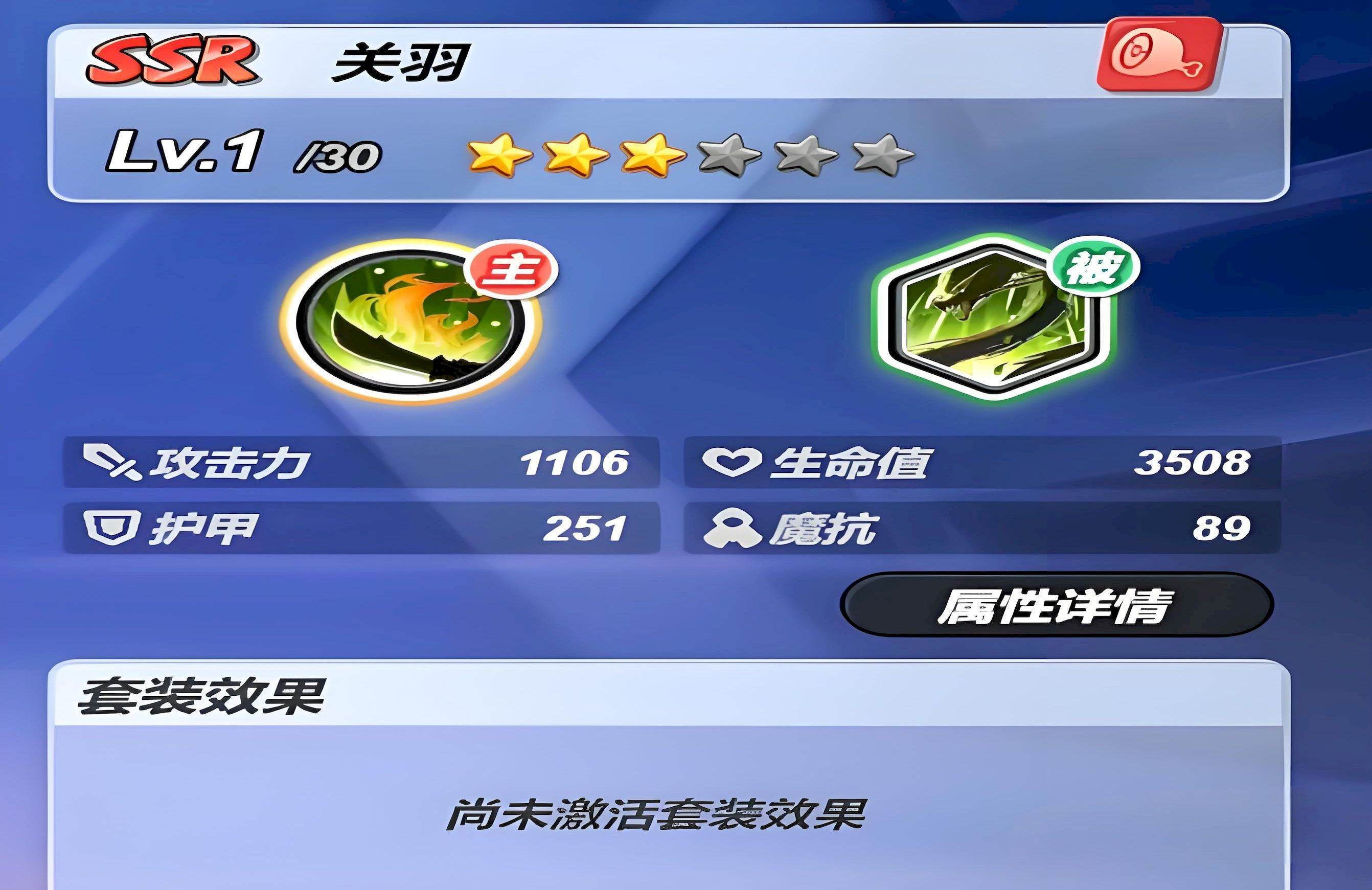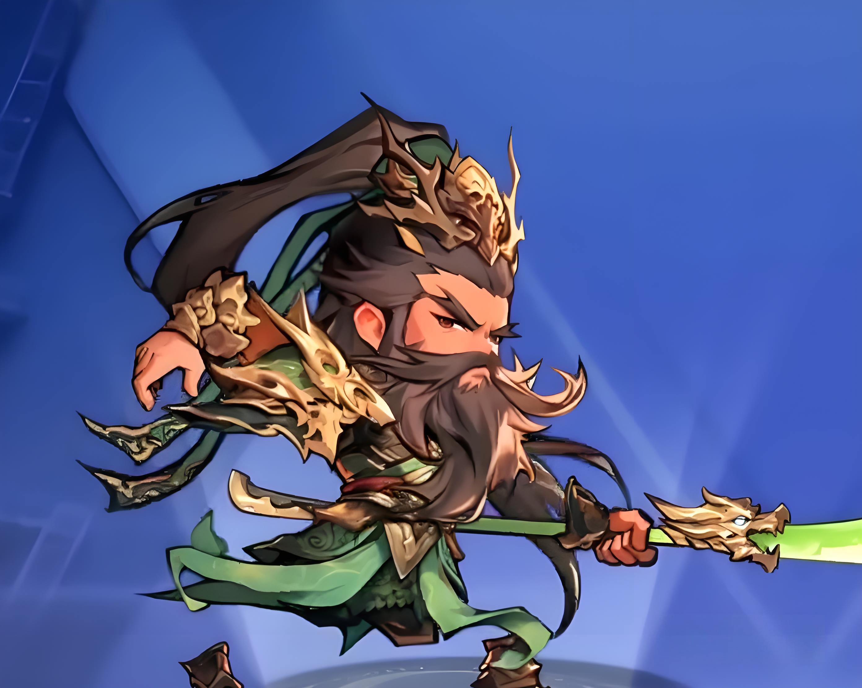 1、关羽是游戏内高稀有度角色,以传统武圣形象呈现,手持青龙偃月刀,各方面参数均衡且强势,新人老手均能轻松上手。