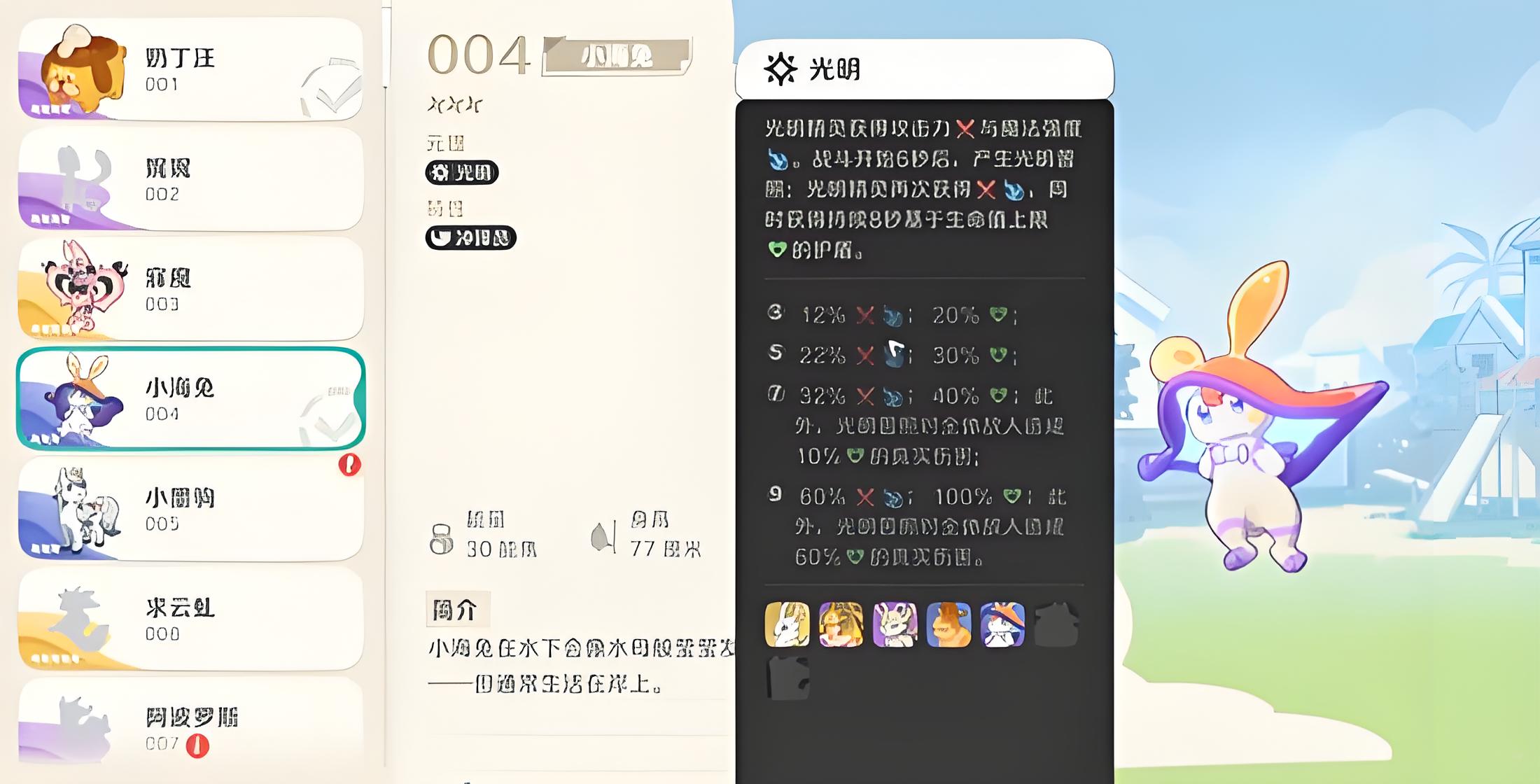 1、核心定位与基础属性上,小海兔是前排冲锋员,身高77cm能量30能焦,侧重生命值与近战输出,光明元理特性可给团队加生存增益。