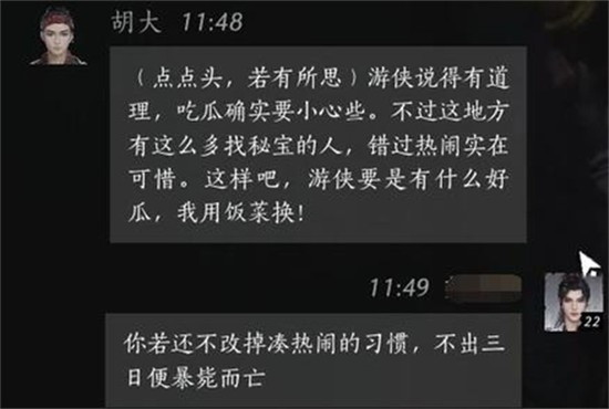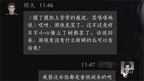 接下来的对话逐步深入,第二句为“我猜这些伤都是看热闹弄的吧”,点出胡大受伤的原因,同时也揭示了他爱凑热闹的性格特点。这句话既带有调侃意味,也为后续劝诫埋下伏笔,是燕云十六声NPC塑造细腻之处的体现。