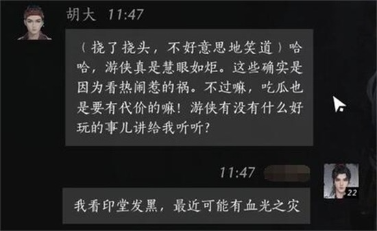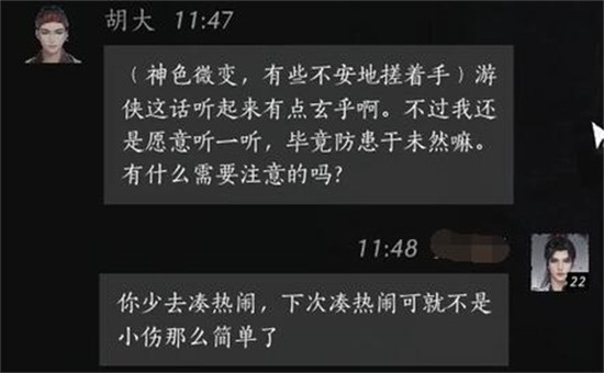 第三句“我看印堂发黑,最近可能有血光之灾”则引入江湖相术元素,增强武侠氛围。第四句“你少去凑热闹,下次凑热闹可就不是小伤那么简单了”开始转向劝导,语气加重,暗示危险临近。这两句在燕云十六声的对话系统中起到了承上启下的作用。