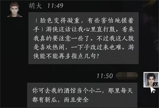 完成全部对话后,胡大将会接受建议,并可能触发后续隐藏奖励或成就。该段对话体现了燕云十六声在NPC交互设计上的用心,通过层层递进的语言节奏展现角色性格与剧情发展。玩家在参与过程中也能感受到浓厚的江湖气息。