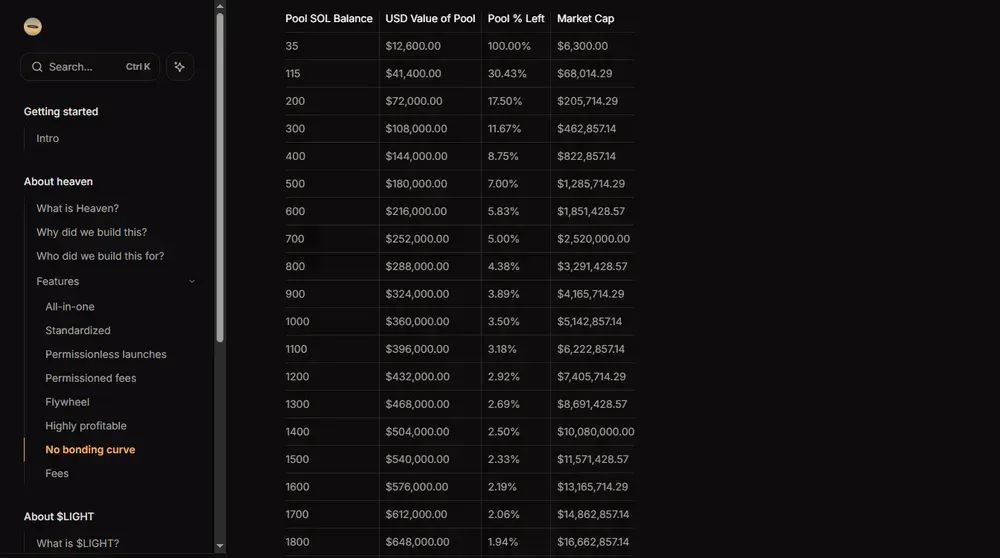 闭环 AMM:所有代币都必须通过天堂系统发行,保证标准化条件,防止无支持或任意注入流动性。标准化参数:每次启动都使用统一的税收、流动比率和费用设置,消除混乱和隐藏的合同风险。无权限访问:任何人都可以即时、无成本地启动令牌,在减少障碍的同时阻止投机取巧的狙击。虚拟 SOL 流动性:代币池通过算法模拟种子余额,确保代币以可靠的深度和可预测的市场底价开始交易。无 LP 费用:Heaven 不向流动性提供商收费,而是通过算法设置较厚的池,在提高稳定性的同时提升协议的盈利能力。分级协议费用:代币成熟的不同阶段采用不同的费用,使代币的成功与天堂的收入飞轮更加一致。创建者代币支持:特殊的收费结构为认真的创建者提供了更多资源,使生态系统的 $LIGHT 代币收益翻倍。
