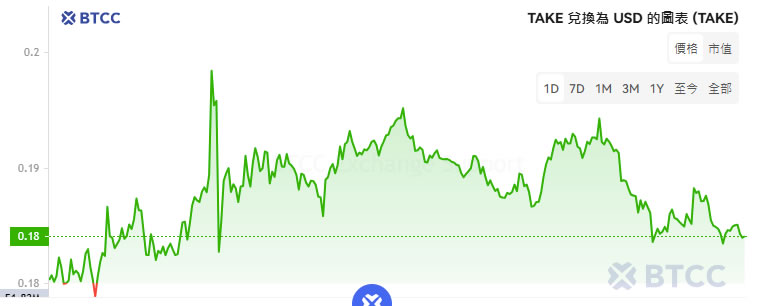 截至当地时间9 月16 日下午5:28,TAKE 加密货币在BTCC 市场的交易价格为0.1801 美元,较前24 小时下跌4.74% ,不过在过去7 天上涨了2.09%。目前,TAKE 在CoinMarketCap 上排名第841 位,市值为23,668,438.09 美元。