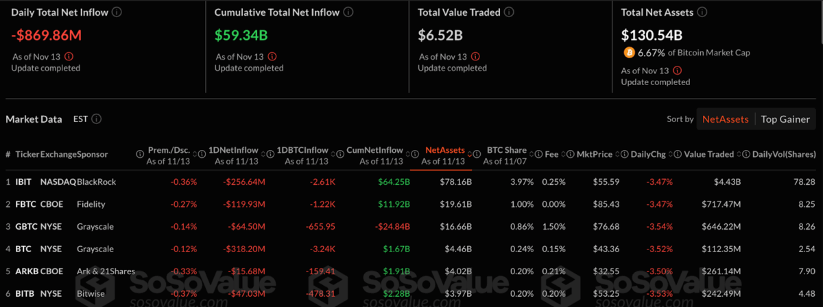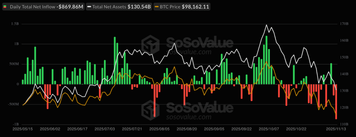 据Sosovalue数据显示,11月13日美国比特币ETF遭遇约8.69亿美元资金外流,标志着市场情绪急剧转变。这一历史第二大规模的单日撤资表明,随着比特币价格自6月以来首次跌破10万美元关口,投资者正变得愈发谨慎。